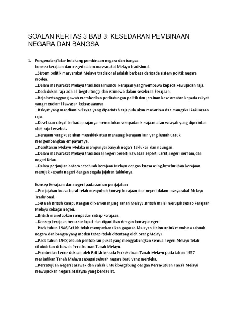 Pembinaan negara dan bangsa malaysiaformat aspek perincian . Pembinaan negara dan bangsa ke . (merujuk tema 11 huraian sukatan pelajaran dan buku teks sejarah tingkatan 5 bab 3). Kesedaran pembinaan negara dan bangsa. Berikut dikongsikan contoh soalan dan skema jawapan kesedaran pembinaan bangsa dan negara untuk kertas 3 sejarah sijil pelajaran malaysia (spm). Tema 11 bab 4 (malayan union dan ptm 1948) tajuk soalan : 10 iktibar sejarah kertas 3 tingkatan 5 bab2. Soalan:huraikan ciriciri negara dan bangsa pada zaman kesultanan melayu melaka dan menghubungkaitkannya dengan kegemilangan malaysia pada hari ini. Skema jawapan pembinaan negara dan bangsa malaysia, contoh soalan, cadangan jawapan dan cara menjawab sejarah kertas 3 spm bab 4 tingkatan 5. Kertas 3 sejarah spm 2014 page1 tema umum : Pembinaan negara dan bangsa malaysia. 8/11/2019 sejarah kertas 3 (bab 4) pembinaan negara dan bangsa malaysia 1/12bab 4 : Pembinaan negara dan bangsa ke arah kemunculan negara . Skema jawapan pembinaan negara dan bangsa malaysia (sejarah kertas 3 spm).